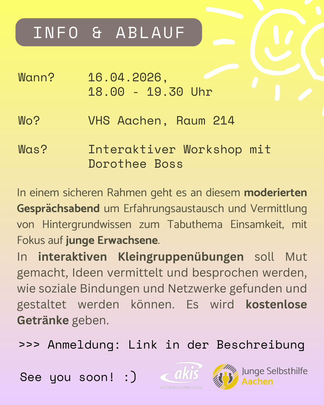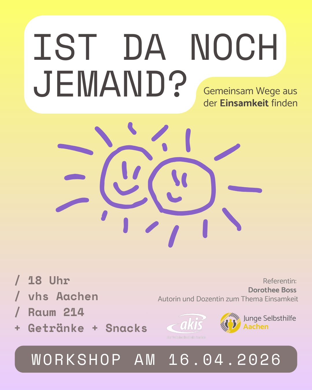 Einsamkeit betrifft heute vor allem junge Erwachsene. Auch nach dem Ende der Coronapandemie fühlt sich fast die Hälfte moderat oder stark einsam. Doch gute soziale Kontakte und stabile Bindungen sind gerade in jungen Jahren besonders wichtig, denn sie machen Spaß und glücklich und sind sehr gesund! In einem sicheren Rahmen geht es an diesem moderierten Gesprächsabend um Erfahrungsaustausch und Hintergrundwissen zum Tabuthema Einsamkeit. Vor allem soll Mut gemacht, Ideen vermittelt und besprochen werden, wie (wieder) gute soziale Bindungen und Netzwerke gefunden und gestaltet werden können. In Kooperation mit der jungen Selbsthilfe Aachen.