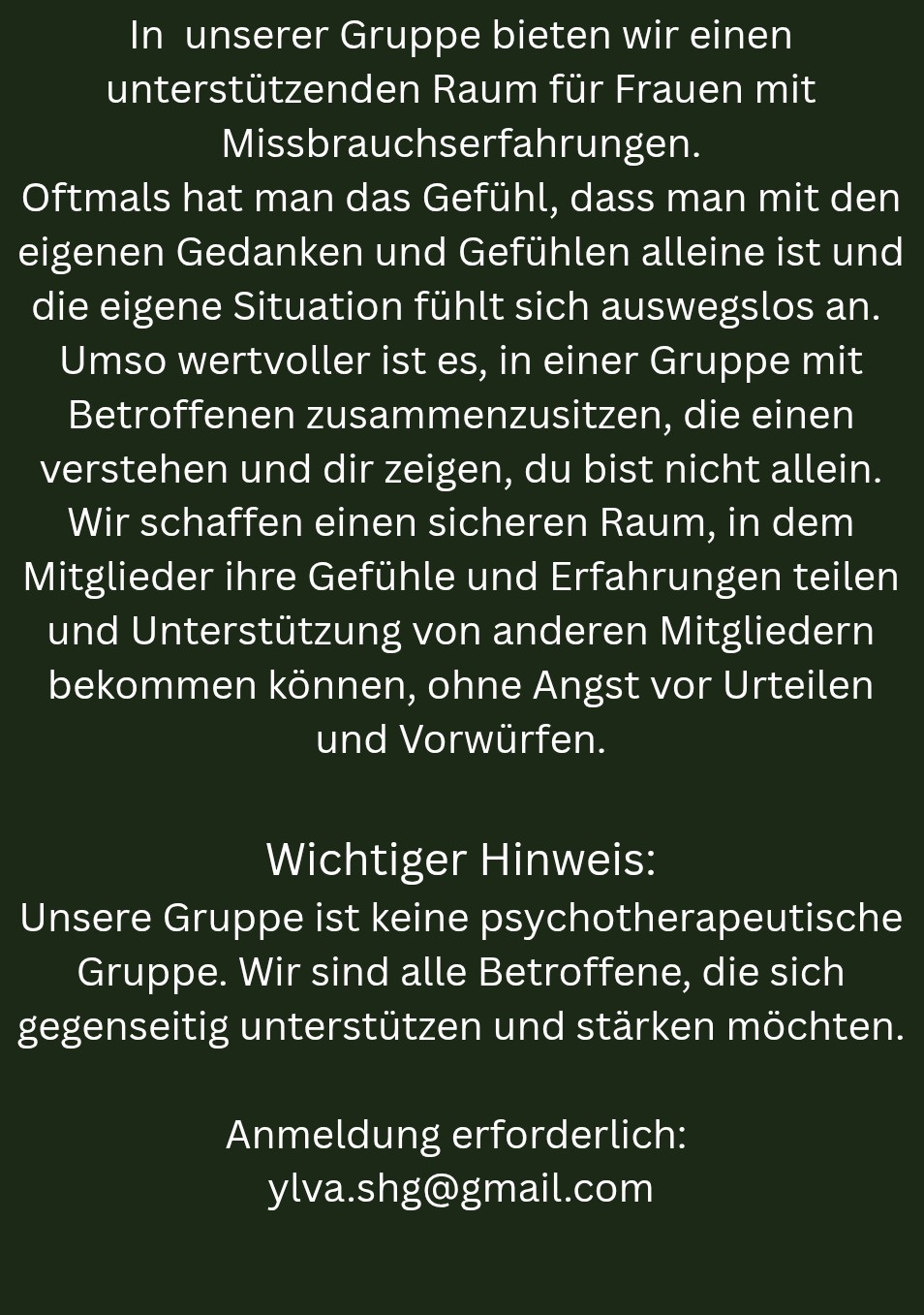 Unsere Gruppe ist keine psychotherapeutische Gruppe. Wir sind alle Betroffene, die sich gegenseitig unterstützen und stärken möchten.